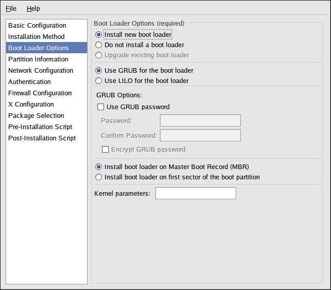 If you choose to install a boot loader, you must also choose which boot loader to install (GRUB or LILO) and where to to install the boot loader (the Master Boot Record or the first sector of the /boot partition). Install the boot loader on the MBR if you plan to use it as your boot loader. If you are using a different boot loader, install LILO or GRUB on the first sector of the /boot partition and configure the other boot loader to boot Red Hat Enterprise Linux.