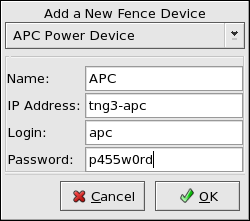 Select the member for which you want to configure a power controller connection and click Manage Fencing For This Node. The Fence Configuration dialog box is displayed as shown in Figure 3-8.