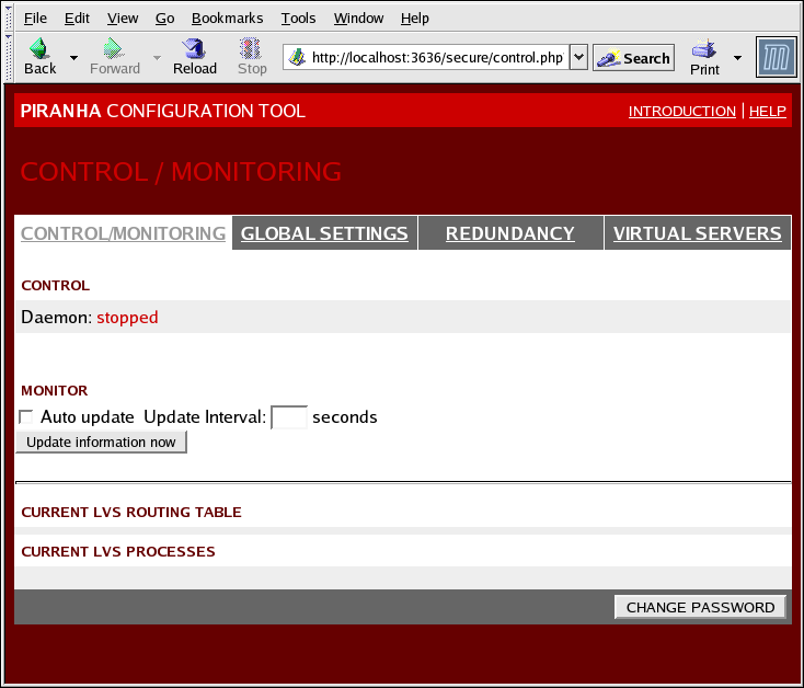 The CONTROL/MONITORING Panel presents the cluster administrator with a limited runtime status of the cluster. It displays the status of the pulse daemon, the LVS routing table, and the LVS-spawned nanny processes.