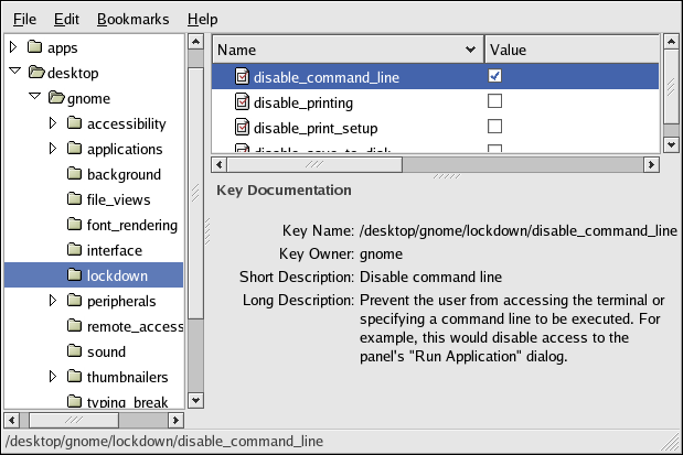 Set the /desktop/gnome/lockdown/disable_command_line key by using GConf editor as shown in Figure 4-6. Setting this key also disables access to the Run Application panel dialog.