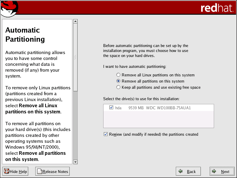 • Remove all Linux partitions on this system — select this option to remove only Linux partitions (partitions created from a previous Linux installation). This does not remove other partitions you may have on your hard drive(s).