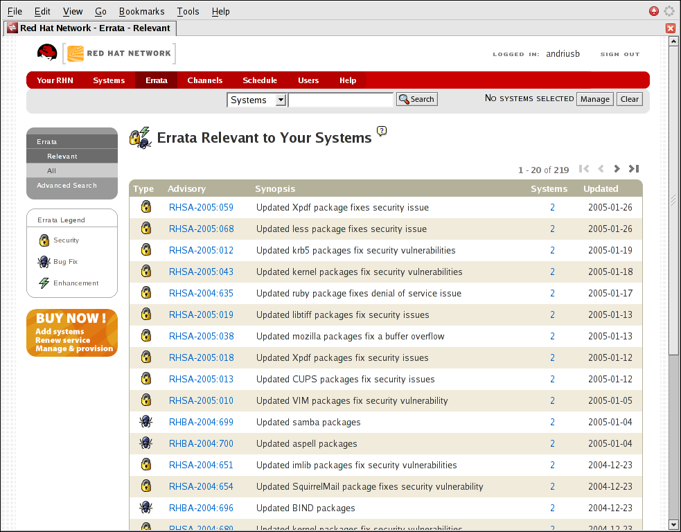 Red Hat Network is an Internet solution for managing one or more Red Hat Enterprise Linux systems. All Security Alerts, Bug Fix Alerts, and Enhancement Alerts (collectively known as Errata Alerts) can be downloaded directly from Red Hat using the Red Hat Update Agent standalone application or through the RHN website available at https://rhn.redhat.com/.