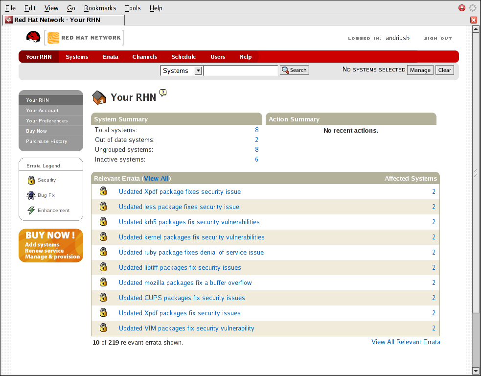 • Red Hat Network website — Manage multiple systems, downloaded individual packages, and schedule actions such as Errata Updates through a secure Web browser connection from any computer