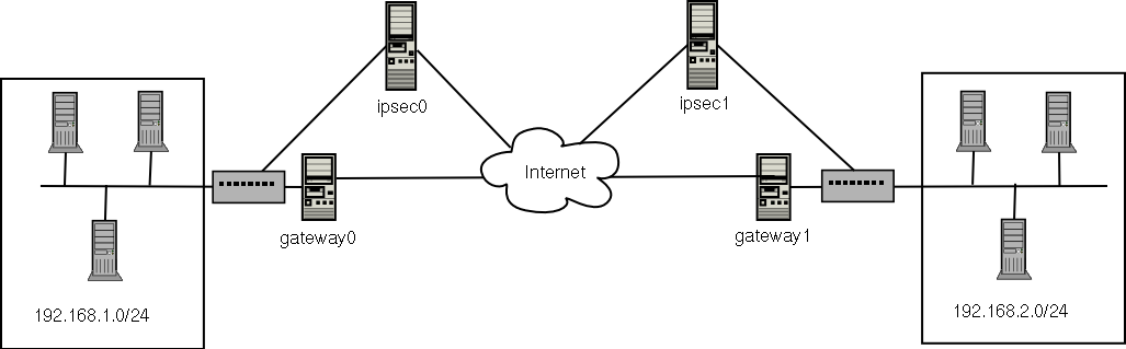 For example, as shown in Figure 18-20, if the 192.168.0/24 private network sends network traffic to the 192.168.2.0/24 private network, the packets go through gateway0, to ipsec0, through the Internet, to ipsec1, to gateway1, and to the 192.168.2.0/24 subnet.