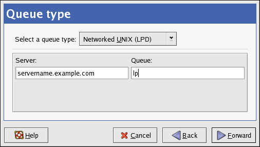 Queue — The remote printer queue. The default printer queue is usually lp.