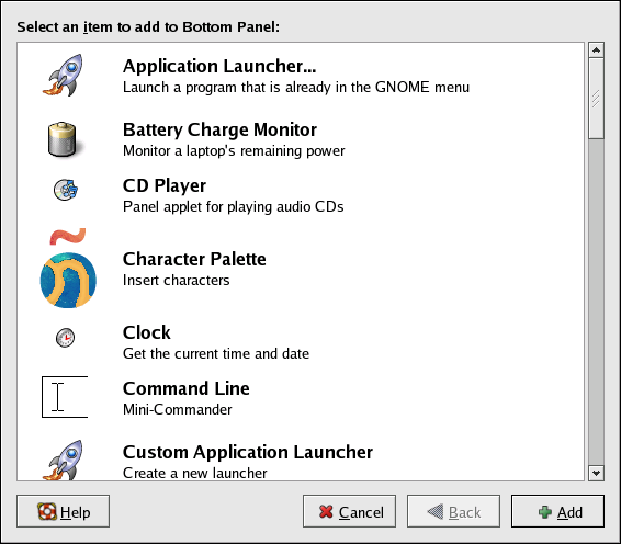 You may add more applets and launcher icons to either Panel in order to suit your needs. Right-click in an unused area of a Panel and select Add to Panel. This opens a window that allows you to choose either an applet or an application launcher. Clicking once on an icon navigates through the list of applications, and double-clicking adds an application to the panel. Figure 2-13 shows the Panel with the Weather Report added to show the current local weather and temperature.