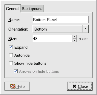 You can hide the panel automatically or manually, place it on any edge of your desktop, change its size and color, and change the way it behaves. To alter the default panel settings, right-click in an unused area of the panel and select Properties. If you choose to hide the panel, it does not appear on the desktop until you move your mouse pointer over the panel area.