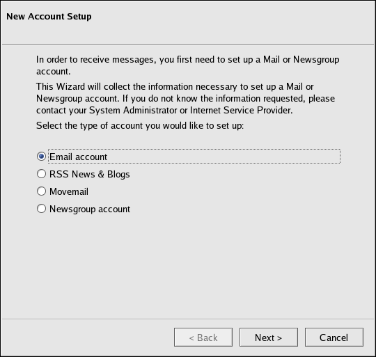 You are presented with a New Account Setup screen. You are first asked whether you would like to import information from other email programs. Make your selection and click on the Next >> button. On the next screen, select Email account, which allows you to configure your email connection. Follow the on-screen instructions and fill in the information you collected from your ISP or administrator in the text boxes provided.