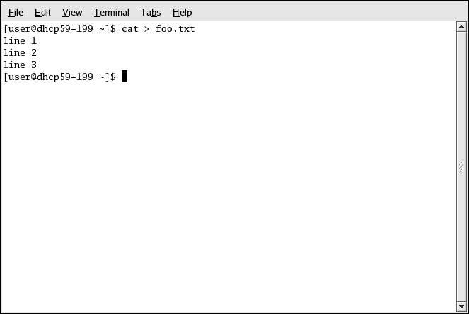 Remember that the cat command echoes the text you enter on the screen. Those echoes are the standard output of the command. To redirect this output to a file, type the following at a shell prompt and press Enter: cat > foo.txt. Enter a few more lines of text, and use the [Ctrl]-[D] key combination to quit cat.