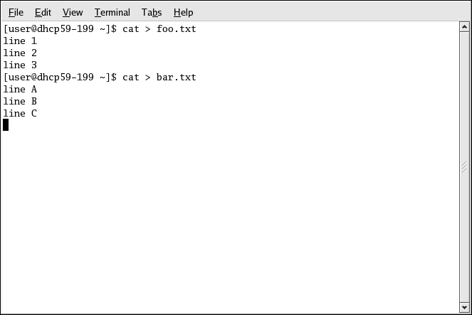 The following screen is another example, redirecting three more lines of text to create the file bar.txt.