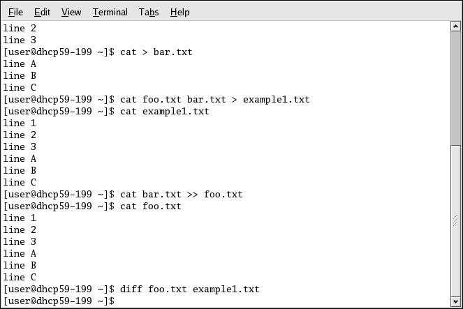 The following screen demonstrates cat's concatenate function, adding the contents of bar.txt to the end of foo.txt. Without redirection to the file example1.txt, cat displays the concatenated contents of foo.txt and bar.txt on the screen.